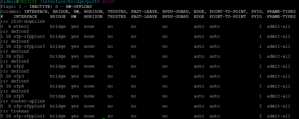 add bridge=bridge comment=defconf interface=sfp-sfpplus2