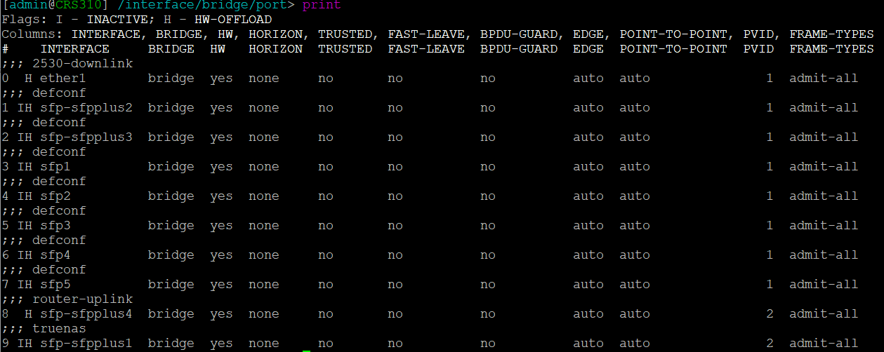 add bridge=bridge comment=truenas interface=sfp-sfpplus1 pvid=2